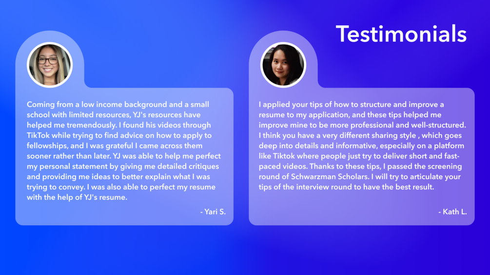 Students, recent graduates, and mid-career professionals I have helped have successfully obtained offers at blue chip companies (Amazon, Apple, Facebook/Meta, Goldman Sachs, Google/Alphabet, JPMorgan Chase, Stripe, Tesla, Twitter), national Fellowship programs (Rhodes Scholarship, Fulbright Fellowship, Marshall Scholarship, Schwarzman Scholars Program, Luce Scholars Program, Gates Cambridge Scholarship), and many other opportunities (State Commissioner, Education Directors, White House Internship, Stripe internship, Salesforce internship, high governmental positions, summer research opportunities, etc.).